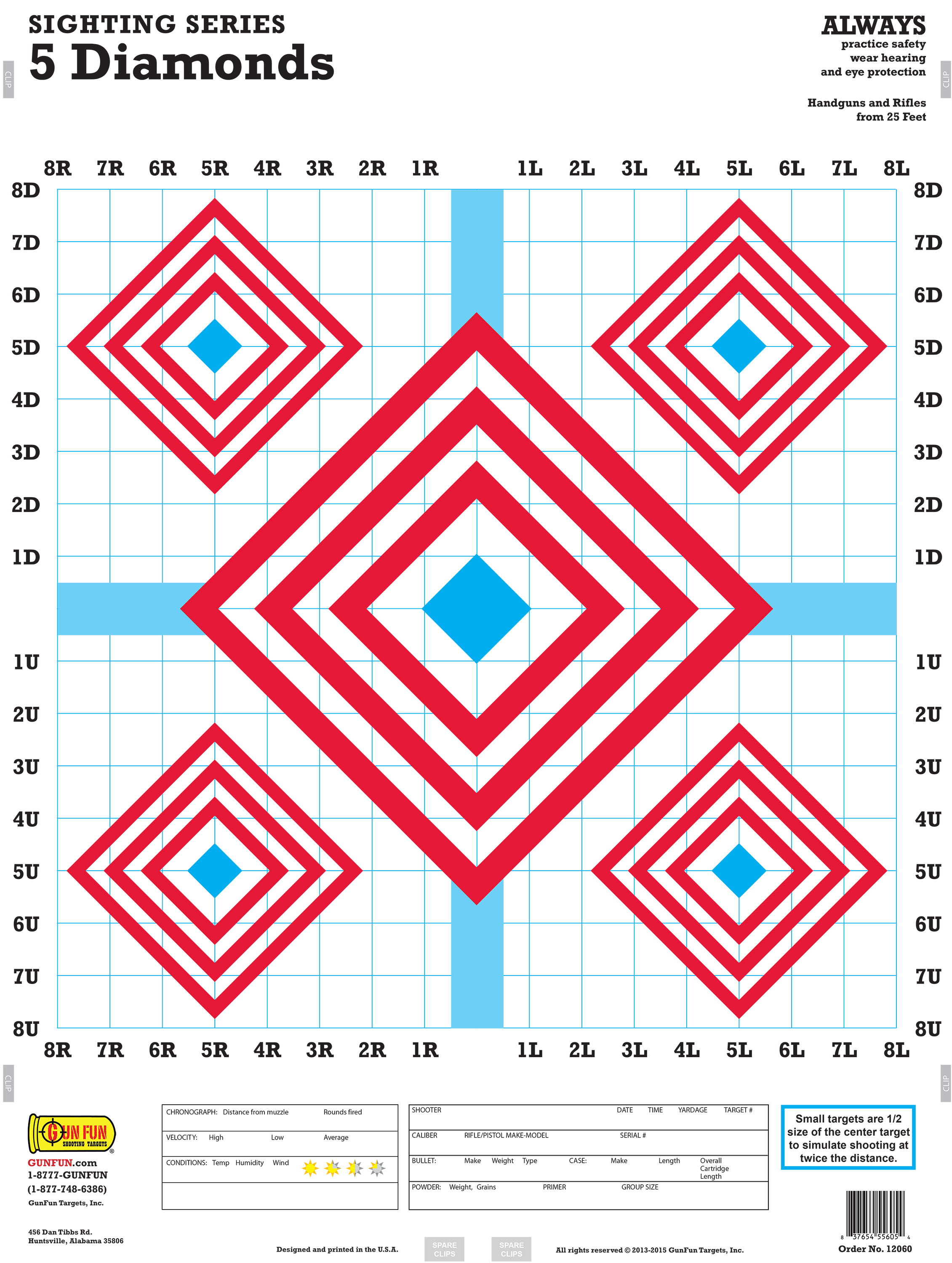 5 Diamonds – a paper shooting target featuring grids with red and blue diamonds made for precision sighting practice.