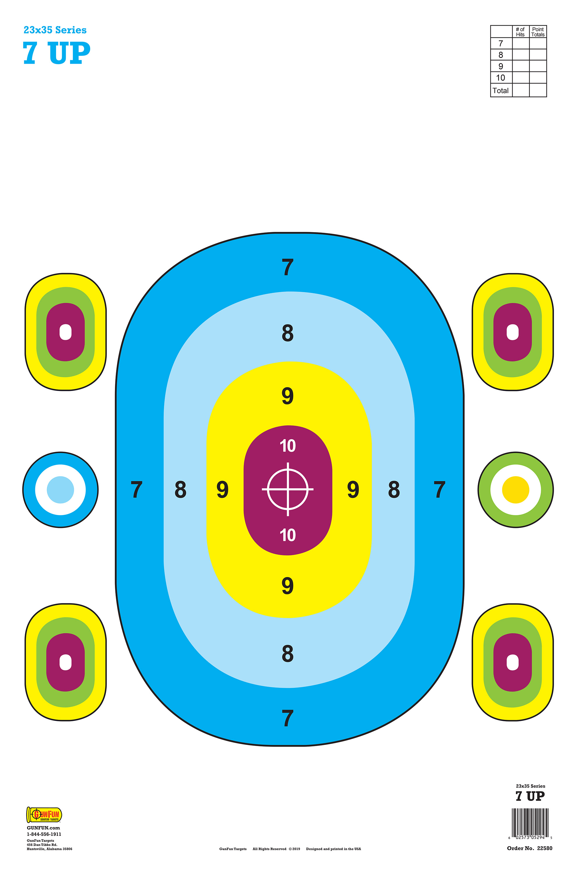 7 Up Competition-Blue/Red – a paper shooting target featuring 1 large and 6 small bullseyes in multiple colors.