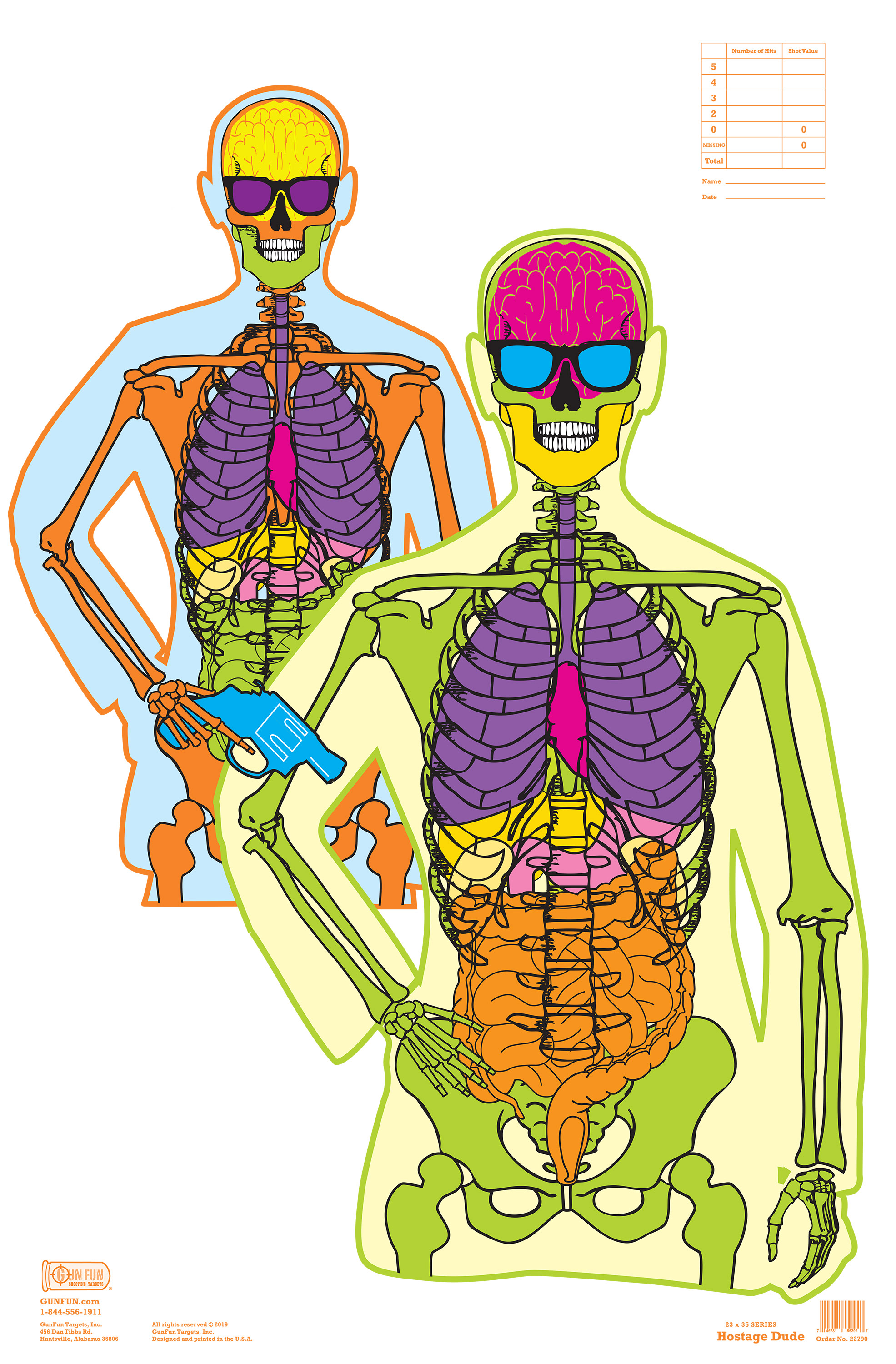 Hostage Dude – A paper shooting target featuring a hostage situation with two dudes with multicolored bones and internal organs on a white background.