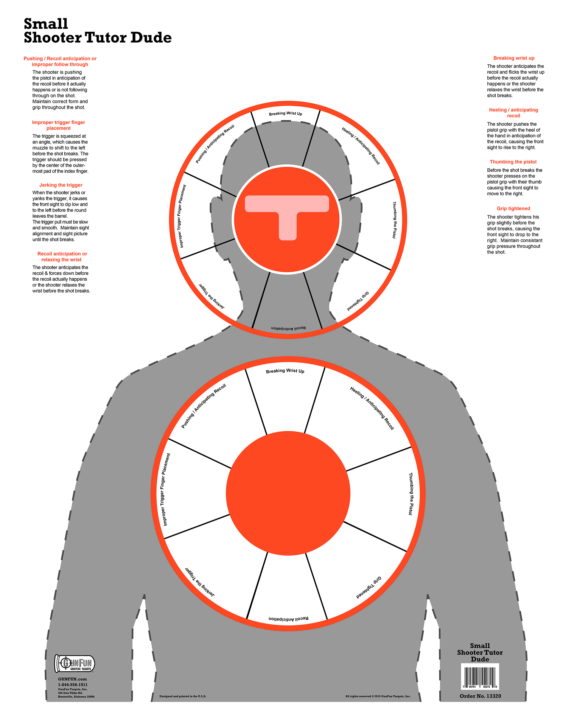 Small Shooter Tutor Dude – a paper shooting target featuring a silhouette and two diagnostic zones.